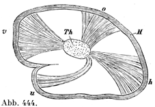 cr. 大脳脚;v. III第三脳室;v. l. 側脳室;r 脳弓(f)の上面と脳梁(c, a. )の下面とのあいだにある側脳室の陥凹;n. c. 尾状核;st. t. 分界条.脳弓の外側稜cからは,側脳室脈絡叢(ch. l. )をもつ柔膜葉が橋渡ししてaに向い付着板の縁に達している.このところ,ならびに脳弓の下面および視床と第三脳室との上面にある柔膜葉は点線であらわし,脈絡叢の上皮は鋸の歯のように多くのでこぼこをもつ線によって模型的に示してある.上下の両柔膜葉のあいだにはゆるいクモ膜下組織(sa. )と2本の内大脳静脈(v. v)の横断面とがある;ch. m. 第三脳室脈絡叢.
