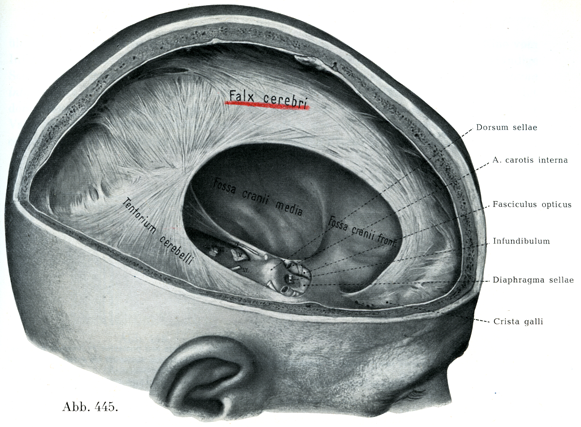 b)内方への突起:内方への突起は矢状方向にのびている2つと横の方向にひろがっている2つとがあって,これらによって頭蓋腔は脳の主要部分に一致したいくつかの小室に不完全に分けられている.矢状方向の突起は脳鎌Hirnsicheln,すなわち大脳鎌Falx cerebriと小脳鎌Falx cerebelliと呼ばれ,横の方向の突起は小脳天幕Tentorium cerebelliと鞍隔膜Diaphragma sellaeとである.(鎌の音は「レン」,訓は「カマ」であるが大脳鎌,小脳鎌などでは訓で読む方が判りやすい.(小川鼎三))小脳天幕はこれに被われた下方の頭蓋腔を上方の頭蓋腔から決して完全に閉ざしてはいない.この開いている口の前方の境界をなして鞍背があり,外側かつ後方の境界は小脳天幕の前縁にある深い切れこみ,すなわち天幕切痕Incisura tentoriiによって形成されている.