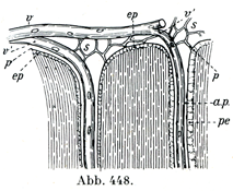 これはクモ膜のもつ特別な構造物であって,膨れた棍棒状をなしていて血管をもたない特有なものである.すなわち蜘継膜絨毛arachnoidale Zotten,パッキオニ顆粒Pacchionische Granulationenなどと呼ばれた.その完成したものは硬膜組織のなかにいろいろな深さに入りこみ,そのために硬膜組織が非常に薄くなっていることもあるので,これらの絨毛は一見骨壁に直接に接し,硬膜の隙間のなかに存在するごとく見える.しかし骨とのあいだには必ず硬膜の薄い層が介在している.顆粒周囲のリンパ腔Perigranulärer Lormphraum(図449)は硬膜下リンパ腔が外方に突き出た部分であって,両者はたがいに開放性につづいている.この絨毛の内部はクモ膜下小梁のつくる網目構造より成り,血管を欠き,絨毛の外面は内皮で被われている.絨毛の柄は細いことも,太いこともある.これらの絨毛は主として上矢状静脈洞の中およびその近くに見られ,また横静脈洞や直静脈洞のところにも存在する.