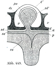 co 大脳半球の灰白皮質;p 柔膜内膜Intima pia;sa クモ膜小梁をもったクモ膜下腔,これが脳膜顆粒加にそのまま続いている;a クモ膜;sd硬膜下腔;sd'脳膜顆粒の硬膜下腔,これは脳膜顆粒の細い柄の周りでsdとつづいている;d硬膜の内板,これは静脈腔ηにより外板のdiから隔てられている;ds脳膜顆粒の硬膜鞘