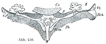 [図450]第三脳室脈絡組織Tela chorioidea ventriculi tertiiとその周囲を通る横断面(W. His1895)