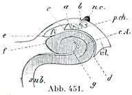 v. l. 側脳室の下角;sub. 海馬傍回;c. A. 海馬足,その脳室面ではdからcまでは白い髄質板で被われ,この髄質板はにおいて海馬采fiに移行している.aとbとのあいだでは脈絡叢p. ch. が脈絡壁Parles chorioideus, Zottenplatte (R. Wetzel)を作っている.外に露われている面を被う柔膜の続きは点線で示してある.n. c. 尾状核尾;f歯状回;g 退行髄板Lamina medullaris involuta,これは白網様質に続いている.