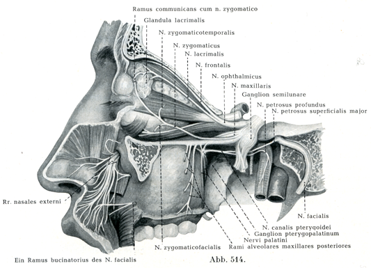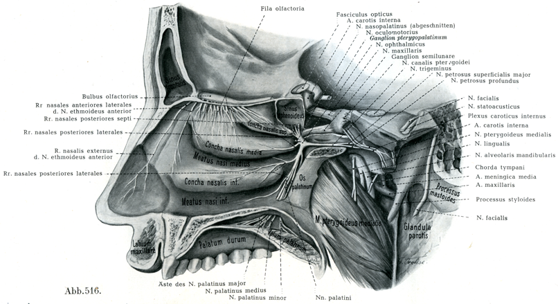 翼口蓋窩のなかにある(副交感神経性の)翼口蓋神経節はその大きさが毛様体神経節の2~3倍もあり,次の3根と結合している.それは知覚根(翼口蓋神経),運動根(大浅錐体神経)および交感根(深錐体神経)の3つである.そのうち後2者はたがいに合して翼突管神経N. canalis pterygoideiとなってこの神経節に入る.翼口蓋神経節には多極神経細胞が集まっている.この神経節から次の枝がでる:1. 外側および中隔後鼻枝Rr. nasales posteriores laterales et septi, 2. 口蓋神経Nn. palatini, 3. 眼窩枝Rami orbitales.