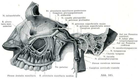 a)後上歯槽枝Rami alveolares maxillares posteriores(図514, 515).これは通常2本あって,眼窩下神経が眼窩に入る前にすでに幹から分かれて,同名動脈に伴って上顎結節のところを下行する.後方の1枝はその線維の一部が上顎骨の外面Außenzvandにとどまって,大臼歯の範囲の歯肉と頬粘膜のこれに隣接する部分とに分布する.そのほかの諸枝は歯槽孔を通って上顎洞の後外側壁に達する.ここでは骨壁にある不完全な管のなかを前方に走り,中上歯槽枝と神経叢の状態をなして結合し,その細い枝を上顎洞の粘膜にだし,また上歯枝Rami dentales maxillaresを3本の大臼歯に送っている.