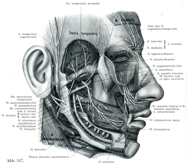 [図517]下顎神経の分枝 外方からあらわしてあり,さらに顔面に分布する眼神経と上顎神経の枝を示す.(4/5)