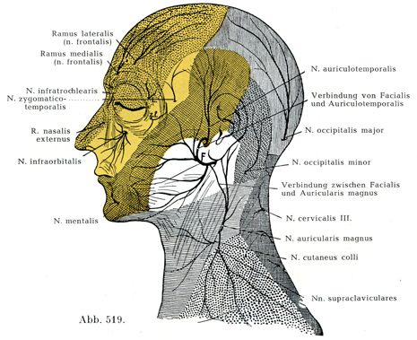 [図519]頭部と頚部における皮神経の分布領域(Corning, Topogr. Anat. より引用)