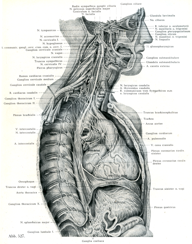 [図527]右側の迷走神経と交感神経の頚部,胸腔および腹腔の上部における分枝(2/5) (HirschfeldおよびLeveilléによる)