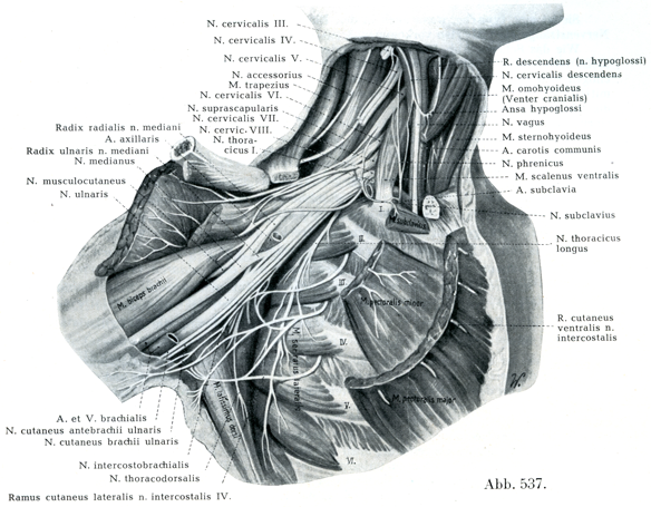 その5つの根のそれぞれに前枝と後枝とが区別される(図539).それらの後枝は合して橈骨神経といくつかのいっそう小さい神経を形成する.前枝についてはまずIとVIIIとが合して1つの幹となり,次いでVII, VIおよびVが合する.この索の上方の部分をなす幹からは正中神経の上方の根と筋皮神経とが出るし,下方の索からは正中神経の下方め根と尺骨神経および前腕と上腕との尺側皮神経が出る.