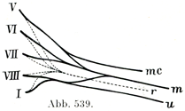 [図539]腕神経叢のもう1つ別の模型図 V~1第5~第8頚神経と第1胸神経との前枝.後方の幹である背側神経束(r)を形成するために集まる線維束は点絵で示してある;r 橈骨神経;mc 筋皮神経;m 正中神経;u 尺骨神経.