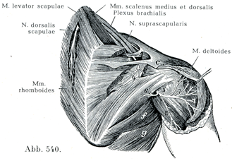 肩甲背神経は腕神経叢の背方の層に属し,CVから枝分れして出て,直ちに中斜角筋を貫き,後斜角筋と肩甲挙筋とのあいだを走り,大および小菱形筋に達してこれを支配する,肩甲挙筋にも1枝を送る.しばしば外側鋸筋の第1尖頭がこれから1本の細い枝を受けている.肩甲背神経はその経路の一部が,頚横動脈の下行枝と伴っている.