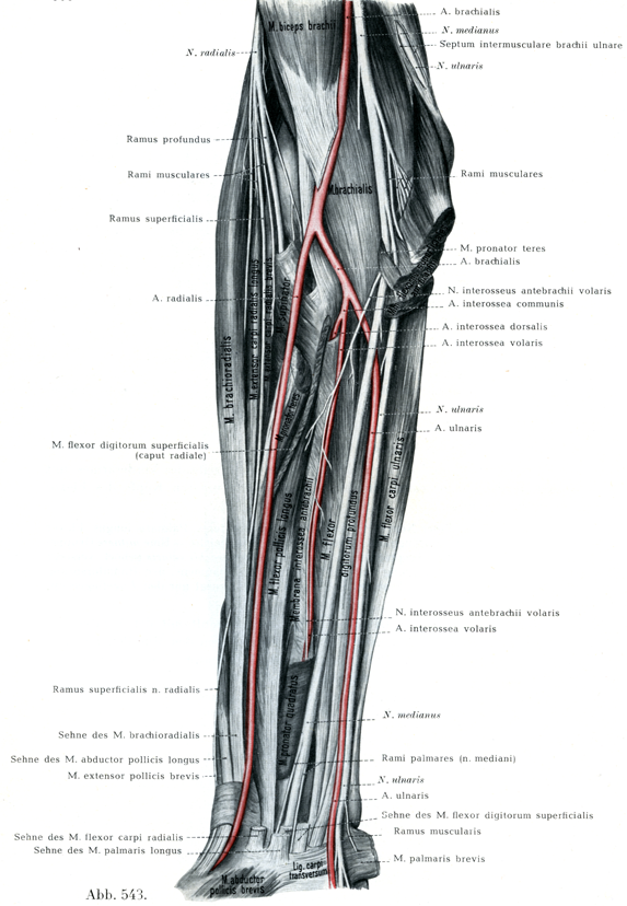 c)掌側前腕骨間神経N. interosseus antebrachii volaris(図543)は掌側骨間動脈とともに前腕骨間膜の上で長母指屈筋と深指屈筋とのあいだを走り,方形回内筋に達してその背側面からこの筋に入る.この神経は次の枝をだしている.