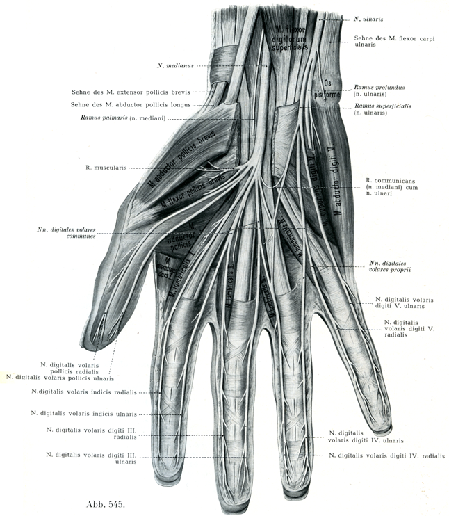 手根管の内部で正中神経が橈側と尺側の各1本の枝に分れる(図545).尺側の枝からは尺骨神経との交通枝Ramus communicans cum n. ulnarisがでて,これは浅掌動脈弓に平行して走っている.尺側と橈側の両枝は筋枝を第1と第2の虫様筋に,また母指球の筋の全体く但し母指内転筋と短母指屈筋の深頭とを除く)にあたえ,次いで3本の総掌側指神経Nn. digitales volares communesに分れ,これらがさらに固有掌側指神経Nn. digitales volares propriiに分れて母指側の3指の両側縁と第4指の母指側縁に分布する(図545).