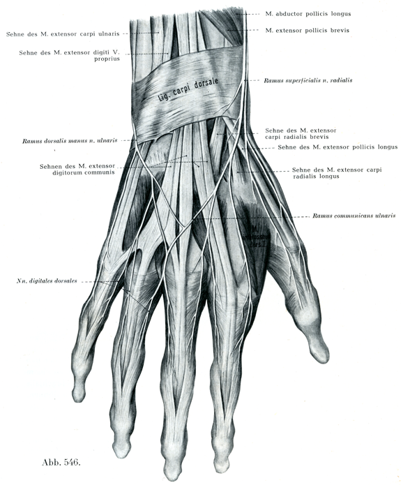 この枝は前腕の遠位1/3で腕橈骨筋の腱の下を通ってこれと交叉し,前腕の背側面に達して,そこを進んで手関節よりやや上方に達する.そして橈側前腕皮神経の1枝と結合したのちに,この神経はいくつかの枝に分れ,これらの枝は手背の橈側半と第1および第2指の背側の両側縁と第3指の背側の橈側縁とに知覚性の神経をあたえる.これが[手の]背側指神経Nn. digitales manus dorsalesである.手背では尺骨神経の背側枝からの諸枝といくつかの結合をなしている.この結合を尺側交通枝Ramus communicans ulnarisという(図546).