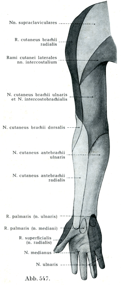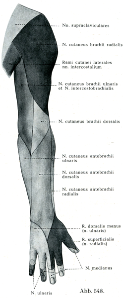 3. 背側前腕皮神経N. cutaneus antebrachii dorsalis(図548).これは背側上腕皮神経よりも太くて,上腕三頭筋の橈側頭と尺側頭とのあいだあるいは尺側頭と腕橈骨筋とのあいだで上腕筋膜を貫き,肘頭と橈側上顆とのあいだをへて,前腕の背側面に達する.この神経は上腕の下部の伸側の皮膚に分布し,また橈側前腕皮神経の分布領域と尺側前腕皮神経の背側枝の分布領域とのあいだの前腕の背側面に分布し,手関節Handgelenkまでは達していない.