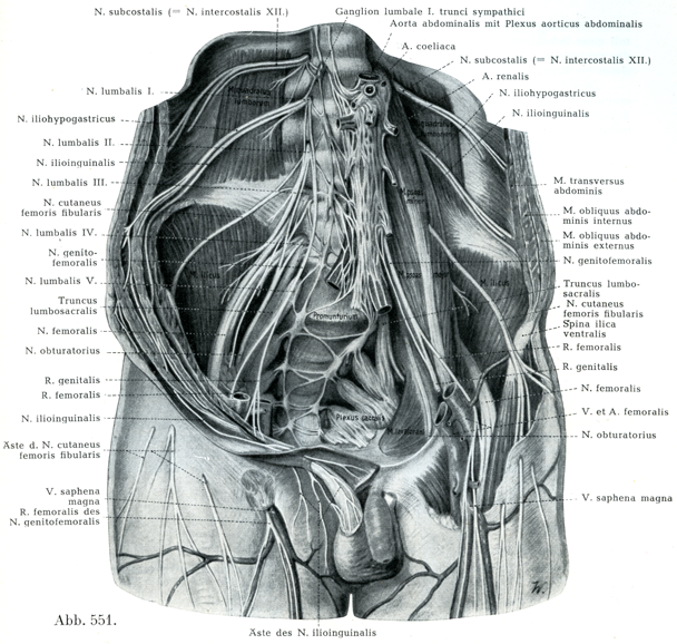 [図551]腰神経叢とその諸枝 前からみる.右側は大と小の両腰筋を取り除いてある.皮膚と幅の広い腹筋群の切り口はそれらの間を広げてある.左側は前腹壁と鼡径靱帯とを取りさつてある.(HirschfeldおよびLeveilléによる.)