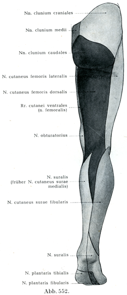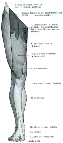 α)膝蓋下枝Ramus infrapatellarisは膝の内側面から膝蓋骨の前面までの皮膚に達する(図555).