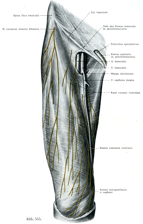 α. 大腿の前面の中央部へ2本の枝がゆく.その1本は縫工筋に1枝をあたえ,多くはこの筋をその上部1/3で貫き,次いで大腿筋膜を貫き,大腿直筋の前を下行して膝にまで達する.他のものは初めは前者と合していることもあり,ごくまれにしか縫工筋を貫いていないで,多くのばあいこの筋の内側面で皮膚に達し,膝にまで進む.これら両枝は大腿枝(陰部大腿神経の)としばしば結合している.--β. 大腿の前面の内側部への枝が多くは2~3本ある.そのうちの1本は筋膜を卵円窩のすぐ下方で貫き,大伏在静脈に沿って走り,膝にまで追跡きれる.これはふつう閉鎖神経の皮枝と結合する.