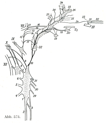 1 上頚神経節;2 下方の節間枝;3 上心臓神経;4および5 第2から第4までの頚神経との結合枝;6 第1頚神経および舌下神経と上頚神経節とを結合する枝;7 迷走神経(節状神経節)との結合;8 舌下神経との結合;9 頚静脈神経,それが舌咽神経(IX)および迷走神経(X)と結合することを示す;10内頚動脈神経;11頚鼓神経;12 鼓室枝;13 頚鼓神経;14 耳管枝;15 小浅錐体神経;16大浅錐体神経;17 膝神経節;18 翼突管神経;19 耳神経節;20 翼口蓋神経節;21 毛様体神経節;22 毛様体神経;23毛様体神経節の長根;24 毛様体神経節の交感根;25 3つの眼筋神経と三叉神経の第1枝(眼神経)とにいたる交感神経の小枝;26 眼動脈への交感神経の小枝;27下垂体と硬膜へいたる枝;28半月神経節への枝;29上喉頭神経への枝;30外頚動脈神経叢への枝;31咽頭枝;32および34 内頚動脈;33 眼動脈.
