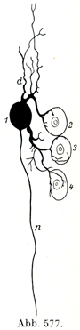 [図576]交感神経細胞,これは樹状突起dと神経突起nとを有っている;e 側枝Cの終末分枝(細胞周囲網Perizellulares Geflecht);f 別の細胞からの線維,これから側枝c が出ている.(SALAによる)