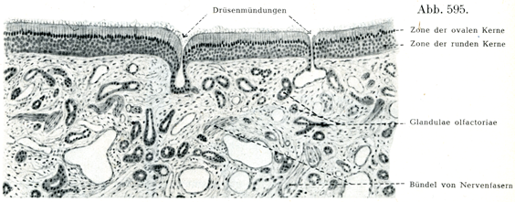さらにヒトの嗅腺のひとつの特徴は粘膜下の貯蔵所subepithelialer Behälter というべき部分があることで,これはさまざまな大きさのふくろで,上皮を貫いて細い導管を外方へ送る一方,反対がわでは何本もの腺管をうけ入れている.この貯蔵所は脂腺の或るものにみられる洞Sinusの像を思わせる.このふくろの壁が外に向かっていくつものへこみをなしていることがある.うすい単層扁平上皮で被われており,内容に固形物は全くない.嗅腺の開口様式の第2の型は線毛上皮で被われたくぼみ,すなわち陰窩Kryptenであるが,これは第1の型よりまれである.これら2型の嗅腺は嗅部の範囲をすべての方向にかなりの広さで越えてひろがっている.