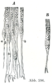 [図596]A. 嗅粘膜の上皮(M. Schultze)×500, a, a嗅細胞, b, b支持細胞.B. 嗅部の縁のところの線毛上皮細胞(M. Schultze)