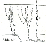 嗅上皮が線毛上皮と境を接するところ,および線毛上皮じしんのなかに,上皮内神経線維intraepitheliale Nervenfasernがあり,これは粘膜の結合組織性の部分から上皮内へはいってきて,ここで細胞と結合することなく上皮中を表面の近くにまで進む. これは三叉神経に属する単純知覚性の神経線維の終末であるが,おそらく一部はまた終神経N. terminalisに属すると思われる(372頁).これと全く同様な自由終末が嗅部の領域内でも嗅糸線維の細胞性終末とともに存在する(図600).
