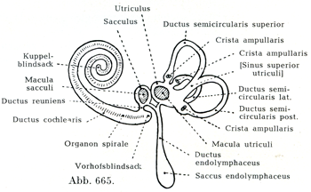 平衡覚と聴覚の刺激を感受する部分は体表面の皮膚とくに表皮の1領域が,奥深いところへ落ちこんで生じたものであって,これに第8脳神経の線維群がきて終わっている.その表皮の1片というのは,ここへ来ている神経の大きさにくらべれば著しく小さいのであって,もともと小脳と延髄の境のところにあるが,すでに胎生の早期に頭部の表皮の下へ落ちこんで簡単な西洋ナシの形をした小胞をなし,まもなく他の表皮の部分とのつながりを完全に失ってしまう.ついでこの小胞は一連の発生過程によって形を変えて,のちには図665で示すような複雑な完成型に達する.この器官の内部には内リンパとよばれる液体がはいっている.この器官の壁は,発生のおこりをなした上皮がさらに発達していったものにほかならない.外皮の場合と同様に結合組織性の要素がこの上皮に付着していて,これが器官全体を支持すると同時に,脈管や神経を導いている.この器官はその複雑な形のために膜迷路とよばれる.その後部は平衡覚にあずかり,前部は聴覚器に属する.