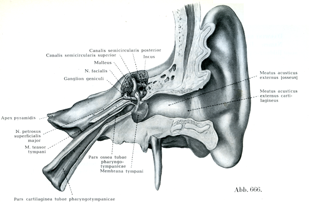 これら両部分からなる迷路はまた内耳とよばれるが,その外側にはいっそう大きい第2の嚢がある.これは頭腸Kopfdarmに属する広い粘膜嚢であって,それの一端は生涯を通じて咽頭腔に開口しているのに対し,他端はひろくなって行きづまりの嚢を形成している.この構造の全体がすなわち耳管鼓室嚢Tuben-Paukensäckchenであって,一種の腸管憩室という意味のものである.出生後しばらくのうちに耳管鼓室嚢は鼻腔と咽頭腔から流れこむ空気をとり入れる.空気をふくむようになったこの部屋が鼓室であって,耳管によって咽頭腔に開いている.鼓室と耳管とを一緒にして中耳という.その位置的関係については図666がはっきりと示している.この図では耳管を切り開いてあって,それが露出された鼓室(骨迷路の外側にある)に続いている.鼓室小骨は一見鼓室の内部にあるようであるが,実は鼓室の中へ突出しているだけであって,やはり鼓室の粘膜で被われているのである.3つの鼓室小骨は鰓弓の骨格に属するものである.