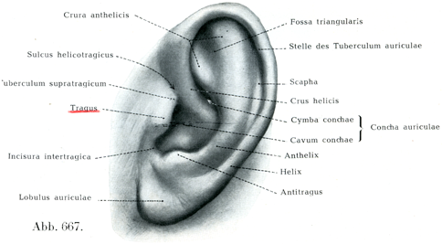 耳輪の下端と対珠とのあいだには対珠耳輪裂Fissura antitragohelicinaという鉛直の裂け目がはいりこんでいる.その深さは個体によってさまざまであって,これが耳輪の下端部を耳輪尾Cauda helicisとして分離している.