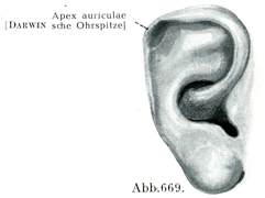 これを(ダーウィンの)耳介尖Apex auriculae[Darwini]という.このような諸例は“ダーウィンの尖り耳Darwinsches Spitzohr"という名で知られ,上に述べたことから祖先がえりatavistische Bildungであると考えられる(図668, 669).
