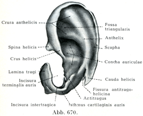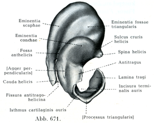 耳介の縁はその全長の大部分がへこんだ内面の方へ巻きこんでいる.かくして耳介の上部3/4をとり囲む隆起が生じ,これを耳輪Helixという.耳輪が外耳孔の上ではじまる部分は耳輪脚Crus helicisとよばれる.耳輪の内側には対輪Anthelixというもう1つの高まりがある.これは外耳孔の上方で対輪脚Crura anthelicisという2脚をもってはじまり,両脚は短い距離だけ走ってから相合して対輪をつくるのである.耳介の前縁には外耳孔を前から不完全に被って後方へ伸びる突起がある.これが耳珠Tragusである.そのうしろには下方の珠間切痕Incisura intertragicaという深い切れこみによって耳珠からへだてられた1つの突起が,下後方から前上方へ伸びている.これが対珠Antitragusであって,対輪が上の方から伸びてきてこれに続く.耳介をなす皮膚のひだは対珠と珠間切痕より下方では軟骨の支柱をもたず,脂肪組織を含んでいるだけである.外耳のこの部分を耳垂Lobulus auriculaeという.耳垂はその基部の後部だけが軟骨の支柱をもっている.それは耳介軟骨の細い1突起である耳輪尾Cauda helicisがここに含まれるのである.