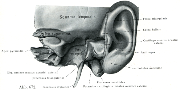 外耳道の軟骨性の部分と骨性の部分とは,軟骨性の管のひろくなった端と外耳孔の粗な外方縁とのあいだにある硬い線維塊によって結合されている.この靱帯(外耳道輪状靱帯Lig. anulare meatus acustici externi)は硬いながらも,やはり軟骨部と骨部のあいだに多少の運動性をゆるしている(図672).