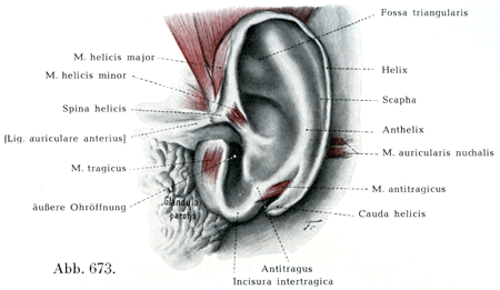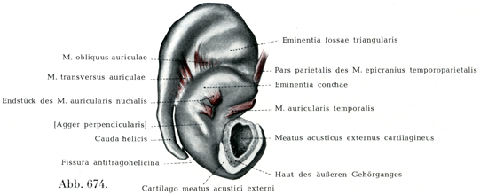 小耳介筋には大および小耳輪筋M. helicis major, minor,耳珠筋M. tragicus,対珠筋M. antitragicus,耳介横筋M. transversus auriculae,耳介斜筋M. obliquus auriculae がある.なおそのほかに存在の不定ないくつかの筋がある:耳輪切痕筋 M. incisurae helicis,耳介錐体筋M. pyramidalis auriculae,茎突耳介筋M. styloauriculalis(図673, 674).