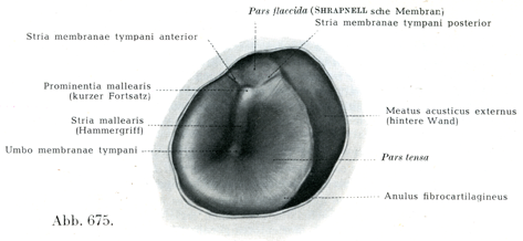 鼓膜の縁は鼓膜縁Limbus membranae tympaniとよばれ,全周の大部分が線維軟骨輪Anulus fibrocartilagineusによって側頭骨鼓室部の鼓室輪溝Sulcus anuli tympaniciにはめこまれている.上方では側頭鱗がその鼓膜切痕Incisura tympanicaのなかに鼓膜を受けいれている.鼓膜は鼓室輪溝のなかに固定されている範囲ではピンと張つた膜をなしており,この部分を緊張部Pars tensaとよぶ.これに反して鼓膜切痕によって受けられている上方の小さい領域はゆるんでおり,弛緩部Pars flaccida(またはシュラプネル膜Shrapnellsche Membran)とよばれる.緊張部は弛緩部より厚いから両部のさかい目が前後2本の細い境界線として見える.これを前および後鼓膜条Stria membranae tympani anterior et posteriorとよぶ.