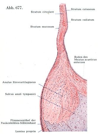 鼓膜の諸層(図677):鼓膜は3つの異なった層からできている.固有板Lamina propriaとよばれる線維性の膜が丈夫な基層をなしている.その辺縁の著しく厚くなった部分が前述の線維軟骨輪Anulus fibrocartilagineusで,これが鼓室輪溝に固着している.固有板の外面には皮膚層Stratum cutaneumがあり,内面には粘膜層Stratum mucosumがある.