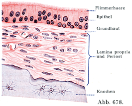 鼓室粘膜の上皮は線毛円柱上皮で,補充細胞をまじえている(図678).しかし鼓膜の内面は単層扁平上皮で被われている(図677).また上述の多くのひだや鼓室小骨の表面の上皮は2~3層の扁平上皮であって,線毛がない.粘膜の結合組織性の部分すなわち粘膜下組織は骨膜とはなはだ密に結合しているので,両者の境ははっきりしていない.