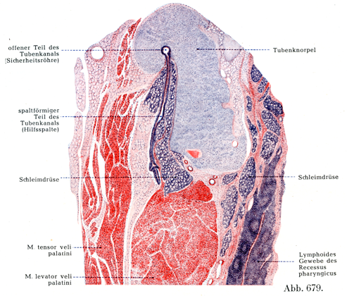 骨部の内腔は血管の充満の程度によるわずかな変化を示す以外は全く動きがない.軟骨部の大部分では線毛をもつ両側壁が相寄っていて,そのため内腔の下部と中部は高さ7mmぐらいの鉛直の裂隙をなしている.しかし裂隙の上部すなわち軟骨のカギの手の部分で囲まれる.ところは,粘膜の表面が軟骨板の曲線に沿ってまるくなっている.そのため内腔の上部は常に開いた管になっており,ここを安全管Sicherheitsröhreとよぶ.そして裂隙の残りの部分は補助隙Hilfsspalteとよばれるのである.しかし軟骨部の前方部では軟骨のカギの手が次第に弱くなり,ついにはなくなってしまうので,粘膜の表面が全体にわたって寄り合っている.補助隙の壁はふだんは相接しているが,口蓋帆張筋が収縮すると,その接触がひき離されうるのである(図679).