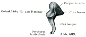 キヌタ骨体Corpus incudisはツチ骨の小頭の後方で,鼓室上陥凹のなかにある.ツチ骨小頭との関節面は前方に向い,ここは深くきれこんで鞍状をなしている またキヌタ骨から2本の突起がでる.長い方のは長脚Crus longumとよばれ,鼓室内を随骨柄の後内側でほぼ鉛直の方向に伸び,下方にゆくほど細くなっている.