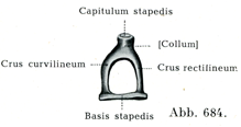 θ)アブミ骨底輪状靱帯Lig. anulare baseos stapedis.前庭に向うアブミ骨底の面はうすい軟骨層で被われ,この軟骨層は骨縁よりもいくらか広くなっている.強靱線維性の1靱帯がアブミ骨底をこれに向いあう前庭窓の縁(ここも軟骨で被われている)に結合している.これがアブミ骨底輪状靱帯であって,著者(Kopsch)はこの靱帯内のところどころに関節腔ともいうべきものを見いだした.