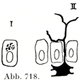 胚芽層のすべての細胞の特徴はその全周に棘をつけていることで,これは細胞間橋Interzellularbrückenとよばれて,多数の細かい突起が隣りあう細胞の表面どうしのあいだに張られているのである.この細胞はそれゆえ有棘細胞Stachelzellenとよばれる(図719, 728).それぞれの細胞間橋は中央部に1つの膨らみがあって橋小節Brückenknötchenとよばれる.この小節はPatzeltによれば接合質からできているというが,Hoepkeはそんなことは全くありえないという.