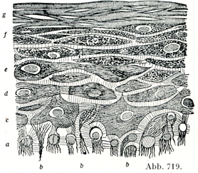 表皮の下部の模型図(E. Kromayer) a 円柱細胞層,b 基底線維(付着線維),これに属する核は断面に現われていない.c あらゆる方向へすすむ線維をもった細胞層,d 皮膚の表面に平行な線維をもった細胞層,e 線維がこわれてケラトヒアリンになりはじめている細胞層,f 顆粒層,g 角質層(のごく小部分のみを示す).