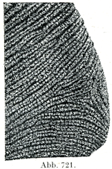 [図721]指の真皮の1片を表皮を除いて示す(落下光線による)×5, 写真によって描く.幅のひろい暗い線は稜間溝に当る.そのあいだにある幅のひろい明るい条は各2本の乳頭列を示す.各2本の乳頭列のあいだの細い暗い線は乳頭間溝であって,汗腺管が通るところである.
