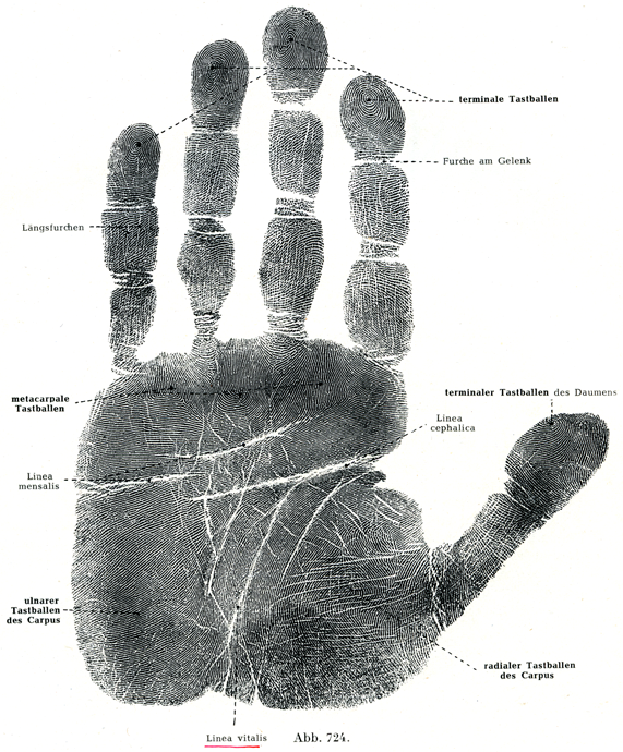 b)中手触覚小球metaka rpale Tastbatlen(図724)はヒトの手には3つしかはっきり見わけられない.手掌の皮膚の遠位端で,尺側の4本の指の指間裂に接して存在し,したがって基節の根もとの部分にも属している.形は長めで紡錘形である.母指と示指のあいだではこれに相当する触覚小球が独立した高まりや独立した紋理としてはみとめられず,橈側の手根小球と合して1つになっている.