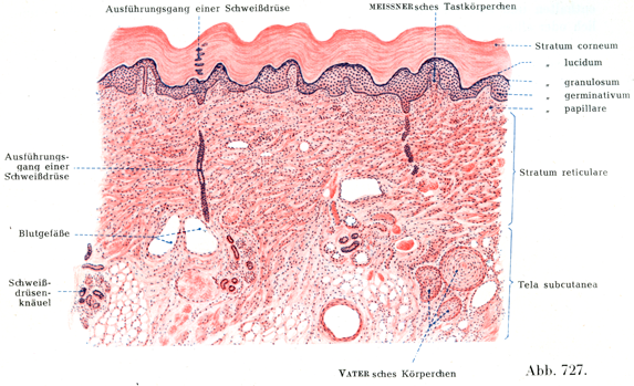 外皮äußere Hautは平たく広がって全身を被うところの器官であり,これを貫いて数多くの器官が外へでている.皮膚を貫く器官には2群があって,それは角質器と腺とである.外皮じしんおよび外皮に特有な諸器官はすべて次の2つの構成部分からできている.1つは外胚葉に由来する上皮性の部分すなわち表皮Epidermisで,もう1つは結合組織性の部分すなわち真皮Coriumである.真皮の下には皮下組織Tela subcutaneaがある.