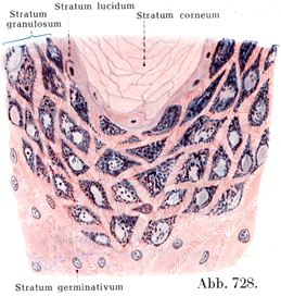 a)胚芽層Stratum germinativum, Keimschicht od. Schleimschicht:深層を占める比較的柔かな層で,真皮の乳頭のあいだにあるくぼみを充たし,さらに乳頭の高さより少し上方にまで及んでいる.