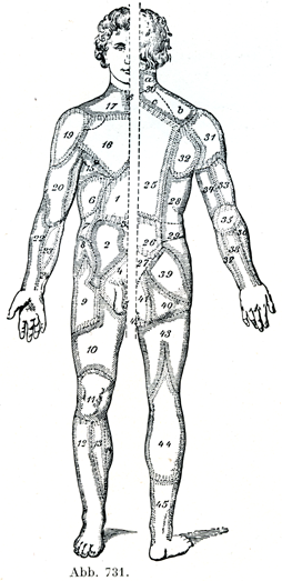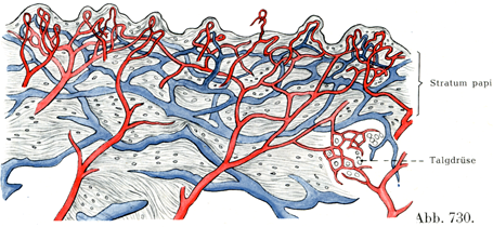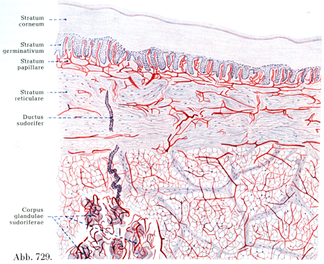 皮膚における皮膚神経についていっそう詳しく述べると,真皮の内面の隙間からはいってきた神経小幹は,たえず枝分れしながら次第に乳頭層にまで上つてきて,ここで乳頭の下に終末[神経]叢Endgeflechtをつくる.この叢には深部と浅部がはっきり区別できる.深部はかなり粗い網目をなす比較的太い小枝でできているが,浅部はもっと網目がこまかくて少数の細い線維からできている.この細かい方の終末叢では神経線維の分岐がみられる.そして最後にこの叢から個々の神経線維また嫡小さい線維束が上方へ出て,乳頭および表皮に達する.神経のほかの一部はすでにその前に,皮下組織や毛や皮膚の腺・筋・血管などに終わっている.