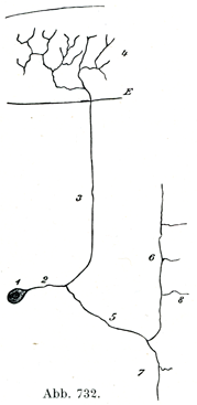 1 脊髄神経節細胞,2 その突起,3 末梢への部分,4 胚芽層の上皮細胞間迷路における終末分枝,5 中枢への部分,6 脊髄内の上行枝,7 下行枝,8 知覚性側枝,E 表皮(G. Retzius)