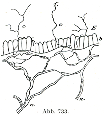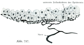 有髄神経組織は結合組織の縁のところで枝分れして,髄鞘をつけたまま上皮の下縁に達する.ここで髄鞘を失って軸索だけ表皮内に進入し,ここで上皮の細胞間を通る.軸索は上皮内で何度か細かい枝に分れる.これらの細枝は何本かの神経原線維と,いくらかの原線維周囲物質とからなっており,たがいに吻合しながら胚芽層の外縁にまで達し,角質層には入らない.これらの細枝が細胞のあいだで小さいボタン状の膨らみ(Knöpfchen) (図734)をなして終り,その膨らみのなかで神経原線維が1つの閉じた網をなしている(Boeke, Stöhr).