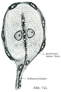 軟かい内棍は横たわつた平たい棍細胞Kolbenzellenがいくつか重なってできている.はいって来た軸索はこれらの細胞のあいだに終末分枝をなしている.そのさい軸索はラセン状にまがって走りながら枝分れして多くの側枝をだし,これらの側枝がまたうねって走ることがある.そして終末分枝の全体が,棍細胞に接する膨らんだ部分,すなわち静脈瘤のような部分を豊富にもっている.終末分枝の先には小ボタン状の膨らみがついている.静脈瘤のような部分(Varikositäten)と終末小ボタン(Endknöpfchen)のなかには神経原線維の網がみとめられる.HeringaとBoekeによれば,最後の終末係蹄と終末網は棍細胞の細胞体のあいだにあるのではなくて,その内部にある.ここでも“終末周囲細網periterminales Netz”というべきものが存在する(図740).