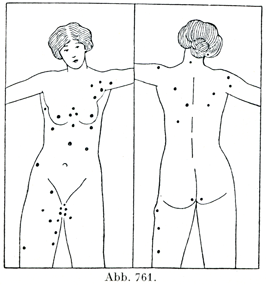 異常な形成状態:乳腺そのものには変化がなくて乳頭が重複していることがある.第3の乳房といわれるものもこの系列に属する.しかし乳頭(とおそらくは乳腺も)が対称的な2つの縦列をなしてできている状態はこれと別のものである.すなわち正常な乳房の上または下に,さらに1つ過剰の乳房があらわれることがあり,そのようなものが2つ以上存在することもある(副乳Mammae accessoriae,小乳房Micromammae).最高記録として8つの副乳頭accessorische Brustwarzenが観察され,そのうち3つは正常にできている乳房の上方に,1つはその下方にあった.霊長類はすべて乳腺器官を1対しかもっていない.従って過剰乳頭の出現は人類と最も近いところで半猿頚その他に見られる状態に結びついている.これについてはWiedersheim, Bau des Menschen, 4. . Aufl.1908, Abb.12~18を参照せよ.--乳腺と乳頭とが全く存在しない状態は無乳[房]症Amastiaとよばれる.また乳腺はないけれども,乳頭はたとえ色素斑としてでも存在する場合は,形成不全Aplasiaということになる.多乳房症Hypermastiaというのは完全に発達した副乳腺のみられる場合で,多乳頭症Hypertheliaというのは完全または不完全に形成された余計の乳頭があるが,それに乳腺組織はない場合である.また乳頭がなくて乳腺組織だけ発達し,個々の乳管が皮膚表面に独立の開口をもっている状態に対して,v. Eggelingは多乳腺症Hyperadeniaという名前を提唱している.--過剰の乳腺は乳腺堤Milchleisteの領域ばかりでなく,ほかの場所にも,たとえば大腿・陰部・臀・背なかなどにも生ずることがある(図761).